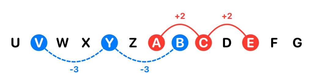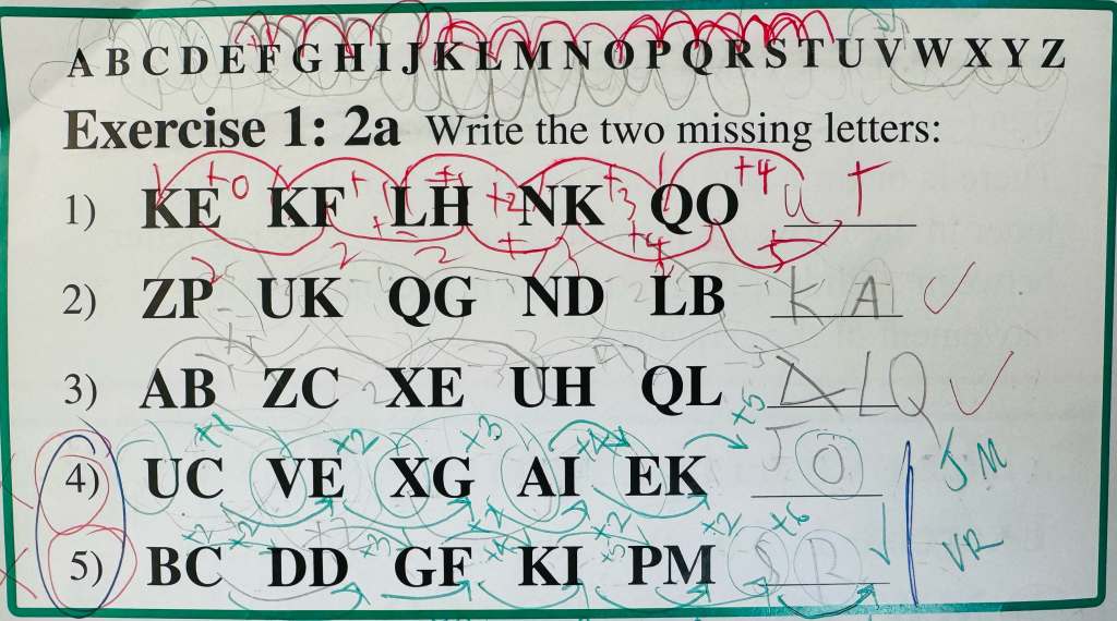Although I donāt find these questions particularly hard, I noticed that Char takes a lot of time to solve them. Part of the challenge is that she often has to write down the entire alphabet and draw arcs to figure out the patterns. But as she works through several exercises, the repeated writing and drawing becomes messy, and the overlapping arcs can make it hard to see whatās going on. This can even lead to mistakes, even when sheās reasoning correctly.